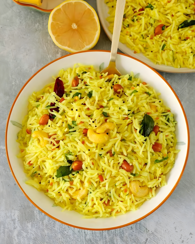 Heat oil and saute mustard seeds, curry leaves, peanuts, and chilies. Add turmeric and mix in cooked rice along with fresh lemon juice. Toss well until the rice absorbs all flavors and turns bright yellow. Serve warm for a tangy and refreshing meal.